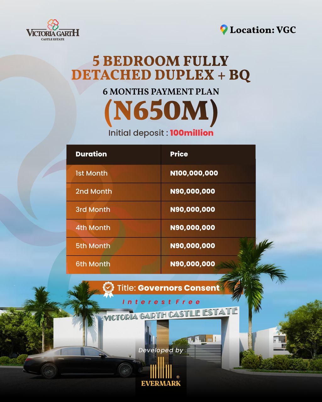 Victoria Garth Castle is an exclusive enclave in Victoria Garden City (VGC), Ikota, Lagos, designed for those who demand the pinnacle of luxury and sophistication. Victoria Garth Castle Estate is a residential development located in Victoria Garden City (VGC), Ikota, Lagos. It offers 5-bedroom luxury duplexes with a BQ. The estate is developed by Victoria Garth Castle Estate Limited, in partnership with Chinese Construction Engineering Company, Coefficient Construction and Xury Construction.
